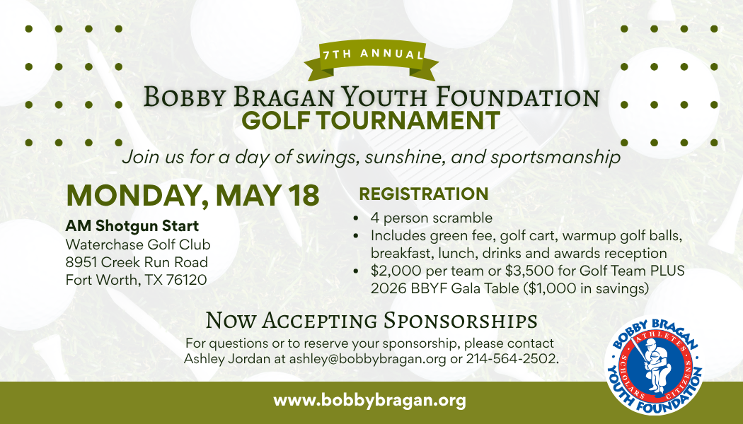 Swing for scholarships! All net proceeds go to the Bobby Bragan Youth Foundation, helping fund $2,500 college scholarships for 8th grade students across DFW! Check back soon for the date of our 7th Annual Golf Tournament!